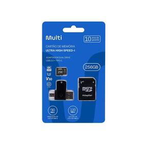 Marca: Multi Modelo: Kit 4 em 1 Cartão de Memória 256GB Ultra High Speed-I U3 + Adptador USB/OTG Tipo C + Adaptador SD - MC154 Cor: Preto Memória: 256GB Velocidade de Gravação: 90 MB/s Velocidade de Leitura: 100MB/s Dimensões -LxAxC-: 9 x 0.05 x 14.5cm Peso: 14g Garantia: 10 anos