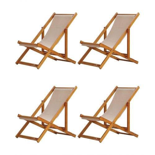 Kit 4 Espreguiçadeira Preguiçosa Dobrável Mel Sb-bege 4 ESPREGUIÇADEIRAS ENVERNIZADA MEL S/BSabe aquele final de tarde que você tanto espera para tirar um descanso merecido? Ou aquela viagem para a praia programada a meses com a família? Pois é, nossas cadeiras espreguiçadeira serve exatamente para esses momentos, com várias opções de cores, os tecidos além de charmosos são hidro-repelentes e se adequam a qualquer ambiente, facilmente removíveis para higienização.Estrutura 100% de madeira maciça e verniz especial, que garante sua qualidade e durabilidade, a espreguiçadeira é totalmente dobrável e reclinável (4 posições de ângulo), perfeita para seu lazer em todos os ambientes, seja ele externo ou interno, esse é o item que definitivamente não pode faltar na vida de quem de fato, quer aproveitar bons momentos! FICHA TÉCNICA DO PRODUTO:04 Níveis de Regulagem de Altura;Tecido Reforçado;Fabricada em Madeira Maciça Pinus;Peso aproximado: 7,5 Kg;Suporta aproximadamente 120 kg;Cor da Madeira: Mel;Acabamento: Envernizada Dimensões aproximadas do Produto:Altura 1: 69 cm;Altura 2: 82 cm;Altura 3: 91 cm;Altura 4: 100 cm;Profundidade: 105 cm. Dimensão aproximada total:Comprimento: 135 cm;Largura: 60 cm; Informações Adicionais:Garantia: 90 dias contra defeitos de fabricação.Acompanha 4 cadeiras Obs. A cor pode variar da foto conforme a tonalidade da madeira e iluminação..
