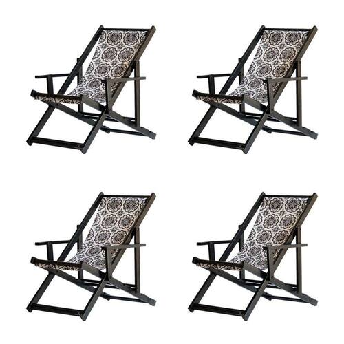 Kit 4 Espreguiçadeiras Dobrável Black Cb-mandala 4 ESPREGUIÇADEIRAS ENVERNIZADAS BLACK C/BSabe aquele final de tarde que você tanto espera para tirar um descanso merecido? Ou aquela viagem para a praia programada a meses com a família? Pois é, nossas cadeiras espreguiçadeira serve exatamente para esses momentos, com várias opções de cores, os tecidos além de charmosos são hidro-repelentes e se adequam a qualquer ambiente, facilmente removíveis para higienização.Estrutura 100% de madeira maciça e verniz especial, que garante sua qualidade e durabilidade, a espreguiçadeira é totalmente dobrável e reclinável (4 posições de ângulo), com descanso para braço, sendo possível montar invertida sem o encosto de braço, perfeita para seu lazer em todos os ambientes, seja ele externo ou interno, esse é o item que definitivamente não pode faltar na vida de quem de fato, quer aproveitar bons momentos! FICHA TÉCNICA DO PRODUTO:04 Níveis de Regulagem de Altura;Tecido Reforçado;Fabricada em Madeira Maciça Pinus;Peso aproximado: 7,5 Kg;Suporta aproximadamente 120 kg;Cor da Madeira: Preta Dimensões aproximadas do Produto:Altura 1: 69 cm;Altura 2: 82 cm;Altura 3: 91 cm;Altura 4: 100 cm;Profundidade: 105 cm. Dimensão aproximada total:Comprimento: 135 cm;Largura: 66 cm; Informações Adicionais:Garantia: 90 dias contra defeitos de fabricação.Acompanha 4 cadeiras Obs. A cor pode variar da foto conforme a tonalidade da madeira e iluminação.. !! Marca: Brasil Móveis