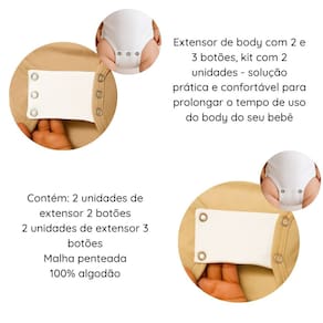 O Kit Extensor de Body é a solução prática e econômica para acompanhar o crescimento do seu bebê com mais conforto e menos desperdício. Ideal para prolongar o uso das roupinhas durante os surtos de crescimento.