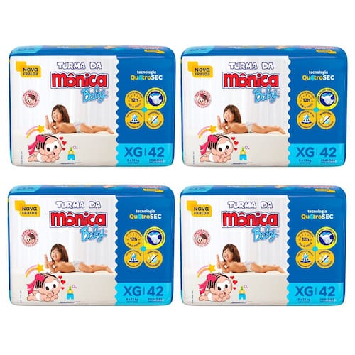 Fralda Infantil Turma da Mônica Baby Mega Tamanho XG A Turma da Mônica Baby uniu proteção e conforto em uma nova opção de fralda, para garantir que seu bebê cresça feliz e tenha as melhores lembranças da sua infância. A Nova fralda Turma da Mônica Baby possui a nova Tecnologia QuatroSec para que ele fique calmo, tranquilo e seguro durante o dia e a noite toda. Conta com um exclusivo sistema de canais que distribui mais rápido o xixi, barreiras anti-vazamento e uma fina camada extra que ajuda a manter o bebê sequinho por até 12 horas, além de cintura elástica que proporciona um perfeito ajuste no corpinho. A Nova fralda Turma da Mônica Baby possui a nova Tecnologia QuatroSec; com um exclusivo sistema de canais que distribui mais rápido o xixi, barreiras anti-vazamento e uma fina camada extra que ajuda a manter o bebê sequinho por até 12 horas, além de cintura elástica que proporciona um perfeito ajuste no corpinho. A Turma da Mônica Baby é uma marca de excelência no mercado de fraldas infantis há mais de 25 anos. A marca e sua turma estão presentes no coração dos brasileiros há mais de 3 gerações, e agora também faz parte do portfólio da Ontex. Os novos produtos foram pensados e elaborados para as mamães e os papais que, assim como nós, valorizam a tradição e os valores culturais aprendidos na infância, alinhado com o conforto e a qualidade dos produtos Turma da Mônica para seu bebê. Modo de uso: 1. Coloque o bebê sobre a fralda aberta com as fitas na parte traseira. 2. Abra as fitas agarradinhas e ajuste a fralda no corpinho do bebê posicionando as fitas sobre a faixa frontal branca. Ean: 7896012879849
