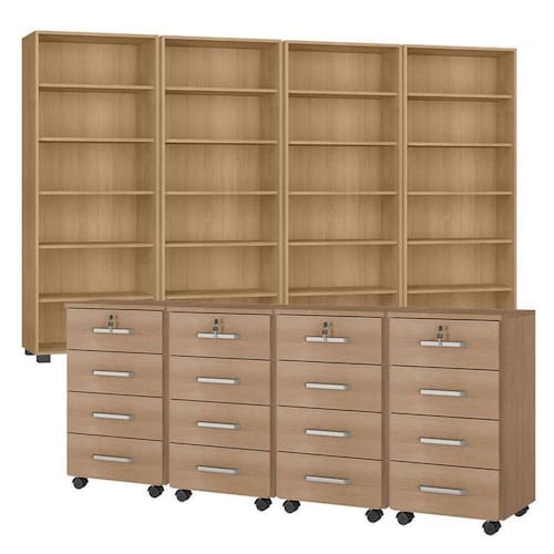 Kit 4 Gaveteiros para Escritório Gávea com Chave e 4 Livreiros Office Freijó Fosco Móveis Leão
