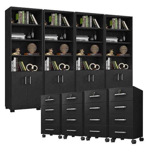 Kit 4 Gaveteiros Para Escritório Gávea Com Chave E 4 Livreiros Office Portas Pequenas Preto Fosco – Móveis Leão