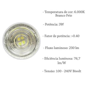 - base: gu10 - formato: mr11 - temperatura de cor: 6000k branco frio - tensão: bivolt - potência: 3w - fator de potência: 0.40 - fluxo luminoso: 230 lm - eficiência luminosa: 76,7 lm/w - ângulo de abertura: 38 - vida útil : 25.000 horas - temp. De operação: -20c 40c - frequência: 50/60hz Ean: 7891072789961