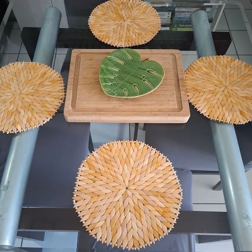 Este lugar americano redondo é uma peça única, feita por artesãos do Estado do Ceará, Brasil. Ele é confeccionado a partir de madeira de alta qualidade, garantindo durabilidade e resistência ao uso diário. As pecinhas de madeira envernizadas acrescentam um toque extra de elegância e sofisticação ao produto.