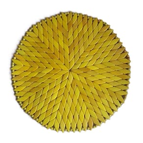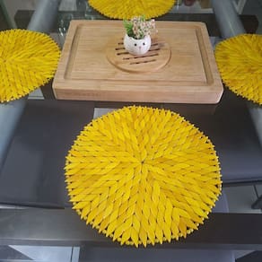 Lugar (Sousplat) americano REDONDO confeccionado em madeira, composto por peças pintadas e envernizadas, na cor amarela, em formato de losângulo, com acabamento nas bordas.