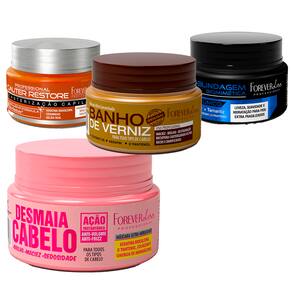 Contém 01 - Mini Máscara Cauter Restore Forever Liss 40g 01 - Mini Máscara Blindagem Capilar Biomimética Forever Liss 40g 01 - Mini Máscara Desmaia Cabelo 40g Forever Liss 01 - Mini Máscara Banho de Verniz Forever Liss 40g