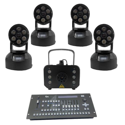 Itens inclusos: 04 mini moving wash led 60w rgbw + 6 leds 8w yg-112 + 01 maquina de fumaça 1200w com iluminação rgb + 01 mesa controladora pilot 2000 dmx one light
