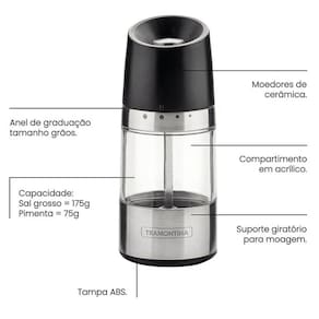 Capacidade: 175g de sal grosso ou 75g de pimenta;