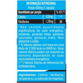 Nitro Fire Cafena 420mg 60 cpsulas Nitromax Kit 4 potes Composio: Cafena, riboflavina, excipiente .S.P estearato de magnsio. Apresentao: Pote com 60 cpsulas. Sugesto de uso: Ingerir 1 cpsula ao dia. Conservao: Aps aberto, manter a embalagem bem fechada e armazenar em local fresco e ao abrigo de luz. Produto lacrado para sua proteo. No utilizar em caso de violao. Manter fora do alcance de crianas. produto dispensado de Registro conforme RDC 27/2010. Marca: Não Informado Ean: 7890022399434