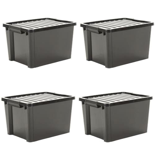 Prático conjunto de contentores LifeBox pretos multiusos de 40 litros com tampas herméticas de alta resistência que permitem empilhá-los para poupar espaço.