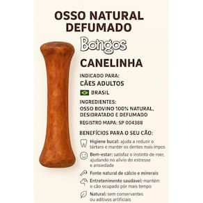 Kit 4 Ossos Para Cachorro Natural Bovino Defumado O Osso Natural Defumado Canelinha Bongos é um produto 100% natural, produzido a partir de osso bovino selecionado, desidratado e defumado sem conservantes ou aditivos artificiais. Desenvolvido especialmente para cães adultos, é ideal para proporcionar saúde, bem-estar e entretenimento ao seu pet. Ingredientes: Osso bovino 100% natural, desidratado e defumado. Indicação: Indicado para cães adultos de todos os portes. Benefícios para o seu cão: Higiene bucal: auxilia na redução do tártaro, ajudando a manter os dentes mais limpos e saudáveis. Bem-estar: satisfaz o instinto natural de roer, contribuindo para o alívio do e da ansiedade. Fonte natural de cálcio e minerais: contribui para a saúde óssea e fortalecimento geral. Entretenimento saudável: mantém o cão ocupado por mais tempo, evitando comportamentos destrutivos. Natural e seguro: sem conservantes, corantes ou aditivos artificiais. Marca: Não Informado