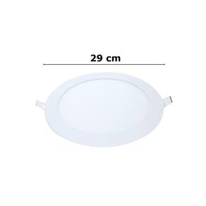 Informações técnicas: LED integrado Potência: 24W Temperatura: 4000K Emissão de luz neutra Diâmetro: 29 cm Forma: Redondo Lúmens: 1680 IRC: =70 Ângulo de abertura: 120 Material: Corpo em alumínio, difusor em vidro, corpo do driver em plástico Eficiência luminosa: 70lm/W Painel de embutir Vida útil: 25 mil horas L70 Pode ser ligado diretamente na rede elétrica em 127V ou 220V Espessura do forro deve ser pelo menos 1cm Não permite dimerização