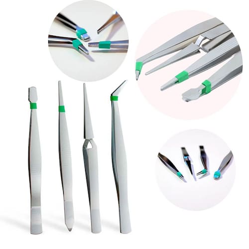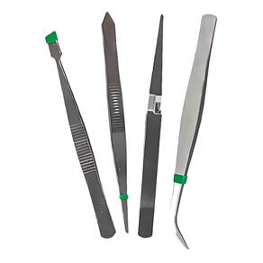 Tipo: Pinças Anti Estática Quantidade: 4 peças Material: Aço inoxidável com revestimento Anti Estática Função: Evita descargas eletrostáticas em componentes eletrônicos Uso: Eletrônica, manutenção, relojoaria, modelismo e laboratório