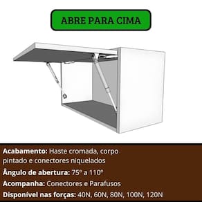 Especificações Técnicas: Material: Aço reforçado e plástico de alta durabilidade. Acabamento: Haste cromada, corpo pintado, conectores niquelados. Não necessita lubrificação. fácil instalação com alinhamento preciso. prolonga a vida útil dos móveis com fechamento silencioso. moderniza ambientes com um toque funcional e sofisticado.