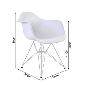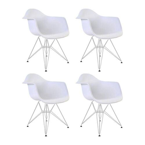 Kit 4 Poltronas Eames Eiffel Branca Com Braço Daw Ferro BrancoA Poltrona Daw traz ousadia que combina com ambientes de estilo moderno, podendo ser usada em escritórios, cafés, salas de estar ou jantar e outros ambientes. Possuindo braços que a torna uma ótima escolha para quem está em busca de conforto e um design único.Tipo: PoltronaModelo: DawCor do Assento: BrancoCor da Base: BrancoCARACTERÍSTICASAssento: PolipropilenoBase: FerroSuporta até: 120kgGarantia: 90 DiasDIMENSÕES DO PRODUTOAltura: 80cmAssento até o chão: 40cmBraço do assento até o chão: 65cmLargura: 38cmComprimento: 38cmRECOMENDAÇÕESLimpeza: Utilize um pano macio levemente úmido.Necessita montagem.ATENÇÃOAS IMAGENS SÃO MERAMENTE ILUSTRATIVAS E PODEM SOFRER VARIAÇÕES DE COR E PEQUENOS DETALHES DE ACORDO COM O SEU MONITOR, ILUMINAÇÃO DO AMBIENTE E ATÉ MESMO A SUA PERCEPÇÃO VISUAL.Kit 4 Poltronas Eames Eiffel Branca com BraÃo Daw Ferro Branco