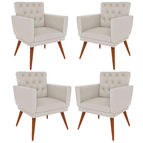 Material da Estrutura: A estrutura interna da poltrona é composta por madeiras de eucalipto, pinus e MDF; Densidade da Espuma: Assento em espuma densidade D-23 e encosto com densidade D-18; Peso Suportado: 100 kg; Tipo de Encosto: Estofado; Tipo de Assento: Estofado; Quantidade de Lugares: 01 Lugar; Volumes: 3; Peso: 20 kg.