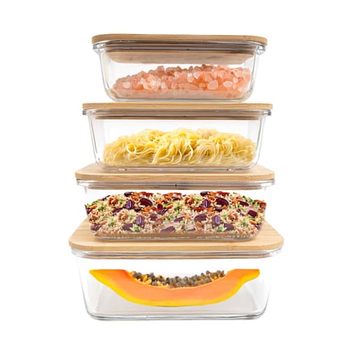 "Oii! Tüd bem? Vem saber mais sobre o kit de 4 potes de vidro com tampa de bambu herméticos quadrados de 600ml, 800ml, 1L e 1,5L da Tüd!