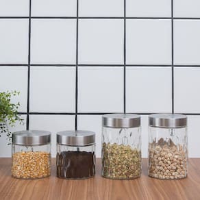 "Conheça o kit de 4 potes bolhas 800ml e 1300ml de vidro com tampa inox redondo da Mozcada.