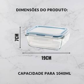 Produto: Kit com 4 Potes de Vidro Herméticos Retangulares Capacidade de cada pote: 1040 ml Marca: AD Quantidade: 4 Peças Cor: Incolor com vedação azul Composição: Vidro pote , Plástico e Borracha tampa Medidas de cada pote: 19,8 cm comprimento x 14,8 cm largura x 5,9 cm altura Peso Líquido de cada pote: 665 gramas