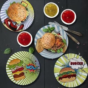 Composição 4 pratos sobremesa burguer 4 molheiras brancas Dimensão Prato: Diâmetro: 19,5cm Altura: 1,8cm Molheira Diâmetro: 7cm Altura: 3,5cm Peças elaboradas em cerâmica feldspática branca de alta resistência, com processo de decoração digital, sobre a base branca. Produto não refratário. Pode ser levada ao micro-ondas e lava-louças. Não libera substancias tóxicas. Tipo de embalagem: caixa litografada. : 90 dias por defeito de fabricação. Podem ocorrer pequenas variações de tonalidades de cor, peso, brilho, textura e tamanho das peças, em função de fatores relacionados ao processo de transformação de matérias primas naturais e variações existentes nas etapas de conformação, decoração e queima.