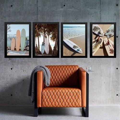 Kit 4 quadros coleção praia surf - pranchas 33x24cm Moldura: madeira branca Informações do produto tire todas as suas dúvidas no descritivo abaixo: decoração para quarto, sala, cozinha, escritório, área gourmet e muito mais. Chega de paredes vazias medidas - cada peça tem 33x24cm a4 . Material do papel - papel fotográfico brilhante de altíssima resolução acabamento - todos os quadros são acompanhados de uma película de acetato para proteção da imagem. - moldura em madeira maciça na cor preta ou branca conforme produto escolhido e pendurador móvel que pode ser retirado facilmente caso deseje fixar com fita dupla face. - os quadros são embalados de forma segura com plástico bolha com camada dupla de acordo com o tamanho dos quadros. Garantia - garantia de 3 meses. Meu quadro chegou. Como posso fixá-lo Você precisa apenas de um martelo e um prego, pois os quadros já vão acompanhados de penduradores. Esta é a forma mais indicada. Caso prefira, você pode utilizar uma fita dupla face neste caso, sugerimos de alta qualidade para evitar que descole e seu quadro caia . Como posso limpar meu quadro A limpeza é feita como um móvel comum da sua casa. Apenas um pano seco ou espanador são suficientes para tal