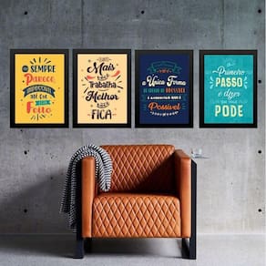 Kit 4 quadros frases motivacionais impacto trabalho 33x24cm - com vidro Moldura: madeira preta Informações do produto tire todas as suas dúvidas no descritivo abaixo: decoração para quarto, sala, cozinha, escritório, área gourmet e muito mais. Chega de paredes vazias medidas - cada peça tem 33x24cm a4 . Material do papel - papel fotográfico brilhante de altíssima resolução acabamento - todos os quadros são acompanhados de vidro para proteção da imagem. - moldura em madeira maciça na cor preta ou branca conforme produto escolhido e pendurador . - os quadros são embalados de forma segura com plástico bolha com camada dupla de acordo com o tamanho dos quadros. Garantia - garantia de 3 meses. Meu quadro chegou. Como posso fixá-lo Você precisa apenas de um martelo e um prego, pois os quadros já vão acompanhados de penduradores. Esta é a forma mais indicada. Como posso limpar meu quadro A limpeza é feita como um móvel comum da sua casa. Apenas um pano seco ou espanador são suficientes para tal
