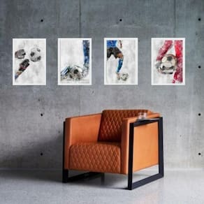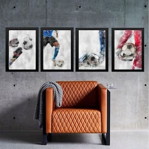 Kit 4 quadros futebol aquarela 45x34cm Moldura: madeira branca Informações do produto tire todas as suas dúvidas no descritivo abaixo: decoração para quarto, sala, cozinha, escritório, área gourmet e muito mais. Chega de paredes vazias. Medidas - cada peça tem 45x34cm a3 . Material do papel - papel fotográfico brilhante de altíssima resolução acabamento - todos os quadros são acompanhados de uma película de acetato para proteção da imagem. - os quadros são embalados de forma segura com plástico bolha com camada dupla de acordo com o tamanho dos quadros. Garantia - garantia de 3 meses. Meu quadro chegou. Como posso fixá-lo Você precisa apenas de um martelo e um prego, pois os quadros já vão acompanhados de penduradores. Esta é a forma mais indicada. Caso prefira, você pode utilizar uma fita dupla face neste caso, sugerimos de alta qualidade para evitar que descole e seu quadro caia . Como posso limpar meu quadro A limpeza é feita como um móvel comum da sua casa. Apenas um pano seco ou espanador são suficientes para tal Ean: 7893911724102