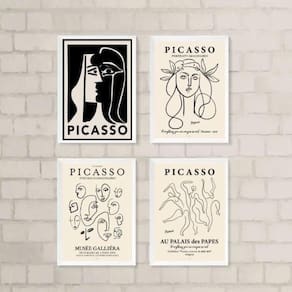 Kit 4 quadros minimalistas obras picasso 24x18cm - com vidro Moldura: madeira preta Informações do produto tire todas as suas dúvidas no descritivo abaixo: decoração para quarto, sala, cozinha, escritório, área gourmet e muito mais. Chega de paredes vazias medidas - cada peça tem 24x18cm a5 . Material do papel - papel fotográfico brilhante de altíssima resolução acabamento - todos os quadros são acompanhados de vidro para proteção da imagem. - moldura em madeira maciça na cor preta ou branca conforme produto escolhido e pendurador . - os quadros são embalados de forma segura com plástico bolha com camada dupla de acordo com o tamanho dos quadros. Garantia - garantia de 3 meses. Meu quadro chegou. Como posso fixá-lo Você precisa apenas de um martelo e um prego, pois os quadros já vão acompanhados de penduradores. Esta é a forma mais indicada. Como posso limpar meu quadro A limpeza é feita como um móvel comum da sua casa. Apenas um pano seco ou espanador são suficientes para tal