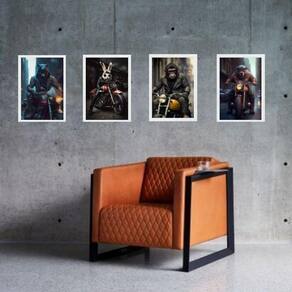 Kit 4 quadros motos - animais motociclistas 24x18cm - com vidro Moldura: madeira preta Informações do produto tire todas as suas dúvidas no descritivo abaixo: decoração para quarto, sala, cozinha, escritório, área gourmet e muito mais. Chega de paredes vazias medidas - cada peça tem 24x18cm a5 . Material do papel - papel fotográfico brilhante de altíssima resolução acabamento - todos os quadros são acompanhados de vidro para proteção da imagem. - moldura em madeira maciça na cor preta ou branca conforme produto escolhido e pendurador . - os quadros são embalados de forma segura com plástico bolha com camada dupla de acordo com o tamanho dos quadros. Garantia - garantia de 3 meses. Meu quadro chegou. Como posso fixá-lo Você precisa apenas de um martelo e um prego, pois os quadros já vão acompanhados de penduradores. Esta é a forma mais indicada. Como posso limpar meu quadro A limpeza é feita como um móvel comum da sua casa. Apenas um pano seco ou espanador são suficientes para tal