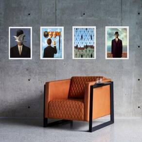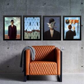 Kit 4 quadros obras renne magritte 24x18cm - com vidro Moldura: madeira preta Informações do produto tire todas as suas dúvidas no descritivo abaixo: decoração para quarto, sala, cozinha, escritório, área gourmet e muito mais. Chega de paredes vazias medidas - cada peça tem 24x18cm a5 . Material do papel - papel fotográfico brilhante de altíssima resolução acabamento - todos os quadros são acompanhados de vidro para proteção da imagem. - moldura em madeira maciça na cor preta ou branca conforme produto escolhido e pendurador . - os quadros são embalados de forma segura com plástico bolha com camada dupla de acordo com o tamanho dos quadros. Garantia - garantia de 3 meses. Meu quadro chegou. Como posso fixá-lo Você precisa apenas de um martelo e um prego, pois os quadros já vão acompanhados de penduradores. Esta é a forma mais indicada. Como posso limpar meu quadro A limpeza é feita como um móvel comum da sua casa. Apenas um pano seco ou espanador são suficientes para tal