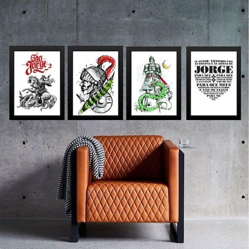 Kit 4 quadros são jorge com oração 45x34cm - com vidro Moldura: madeira preta Informações do produto tire todas as suas dúvidas no descritivo abaixo: decoração para quarto, sala, cozinha, escritório, área gourmet e muito mais. Chega de paredes vazias medidas - cada peça tem 45x34cm a3 . Material do papel - papel fotográfico brilhante de altíssima resolução acabamento - todos os quadros são acompanhados de vidro para proteção da imagem. - moldura em madeira maciça na cor preta ou branca conforme produto escolhido e pendurador . - os quadros são embalados de forma segura com plástico bolha com camada dupla de acordo com o tamanho dos quadros. Garantia - garantia de 3 meses. Meu quadro chegou. Como posso fixá-lo Você precisa apenas de um martelo e um prego, pois os quadros já vão acompanhados de penduradores. Esta é a forma mais indicada. Como posso limpar meu quadro A limpeza é feita como um móvel comum da sua casa. Apenas um pano seco ou espanador são suficientes para tal