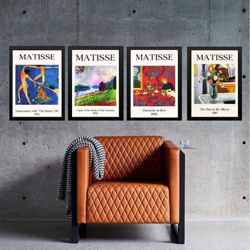 Kit 4 quadros vintage posters matisse colorido 45x34cm - com vidro Moldura: madeira preta Informações do produto tire todas as suas dúvidas no descritivo abaixo: decoração para quarto, sala, cozinha, escritório, área gourmet e muito mais. Chega de paredes vazias medidas - cada peça tem 45x34cm a3 . Material do papel - papel fotográfico brilhante de altíssima resolução acabamento - todos os quadros são acompanhados de vidro para proteção da imagem. - moldura em madeira maciça na cor preta ou branca conforme produto escolhido e pendurador . - os quadros são embalados de forma segura com plástico bolha com camada dupla de acordo com o tamanho dos quadros. Garantia - garantia de 3 meses. Meu quadro chegou. Como posso fixá-lo Você precisa apenas de um martelo e um prego, pois os quadros já vão acompanhados de penduradores. Esta é a forma mais indicada. Como posso limpar meu quadro A limpeza é feita como um móvel comum da sua casa. Apenas um pano seco ou espanador são suficientes para tal