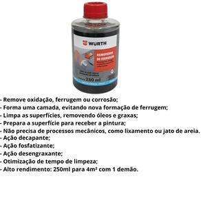 O Removedor de Ferrugem remove todos os resíduos de oxidação, ferrugem ou corrosão nas superfícies do aço carbono e ferro. Atua como decapante, desengraxante e fosfatizante de superfícies metálicas enferrujadas. Após aplicado, a superfície ficará quimicamente desoxidada, formando uma camada de fosfato que impede novas oxidações e formações de ferrugem. Atua como um desengraxante, removendo óleos, graxas e borras, melhorando a adesão de tintas e protetores de superfícies.