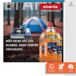 Características Principais: Composição: Mistura de butano e propano, gases altamente inflamáveis que garantem alta performance. Capacidade: 400ml, oferecendo um tempo de queima considerável para diversas refeições. Compatibilidade: Pode ser utilizado em diversos modelos de fogareiros portáteis, desde que sejam compatíveis com o tipo de válvula do refil. Praticidade: Formato compacto e leve, facilitando o transporte e armazenamento. Segurança: Quando utilizado corretamente, o gás Etaniz é seguro e confiável.