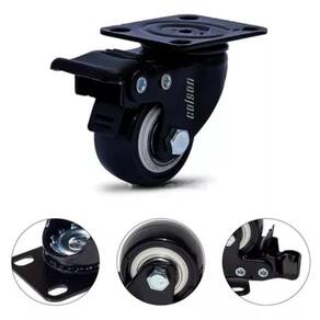 Respostas técnicas: Tipo de rodízio: Giratório com freio Material: Polipropileno de alta resistência Diâmetro da roda: 1,5/8 polegadas Cor: Preto Aplicação: Móveis e acessórios de utilidades para cargas leves Resistente à corrosão e à mobilidade silenciosa
