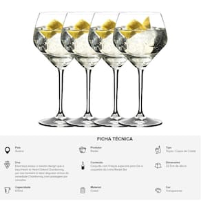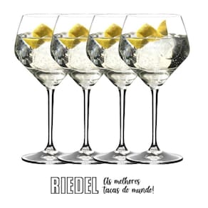 Kit 4 Taças Riedel Bar Gin Drinks Melhor Cristal Do Mundo A Riedel é uma empresa austríaca famosa por fabricarem os melhores cristais do mundoTome seu gin com muito estilo e sofisticação Melhor Cristal do Mundo Altíssima Qualidade País: ÁustriaProdutor: RiedelTipo: Taças / Copos de CristalDimensões: 22,7cm de alturaCapacidade: 670mlMaterial: CristalCor: TransparenteUva: Essa taça possui o mesmo design que a taça Heart to Heart Oaked Chardonnay, por isso também é ideal degustar vinhos da variedade Chardonnay com passagem por carvalho. Conteúdo: Conjunto com 4 taças especiais para Gin e coquetéis da Linha Riedel Bar