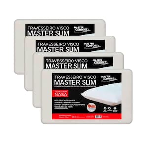 Kit 4 Travesseiros Super Conforto Nasa O Travesseiro Master Viscoelástico possui uma tecnologia desenvolvida pela Nasa e é ideal para quem busca conforto e qualidade. Revestido com 100% de poliéster e espuma de poliuretano. Deixando o momento de dormir tranquilo e revigorante, levando bem-estar para suas noites de sono.