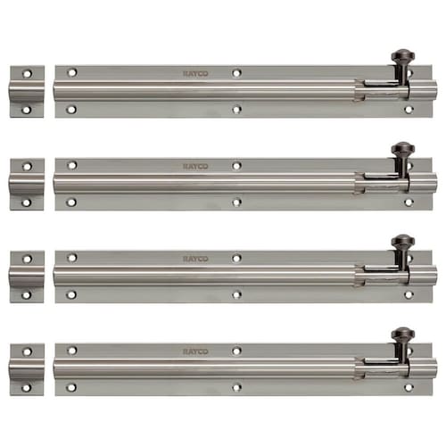 Kit com 4 Trincos 200mm Tarjeta Ferrolho para Porta Fio Redondo 8Pol. Em Alumínio Cromado Rayco O trinco reforçado para portas cromado da Rayco, além de trazer mais segurança, possui um design moderno, deixando sua casa mais sofisticada - Marca: Rayco - Referência: R13485 - Material: Alumínio - Acabamento: Cromado - Comprimento da base: 200mm 8 Polegadas - Largura da base: 31mm - Espessura da chapa: 1,8mm - Diâmetro do Pino: 8mm 5/16 Polegadas - Indicação de uso: portas, portões e janelas - Peso bruto: 165 gramas - Garantia: 90 dias Itens inclusos: - 1 Trinco / Tarjeta - 1 Engate - Parafusos para fixação Ean: 7734625977357