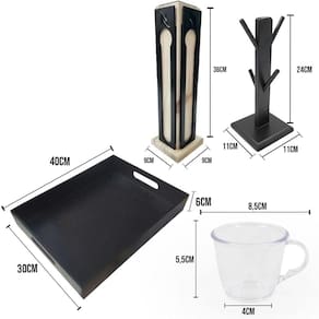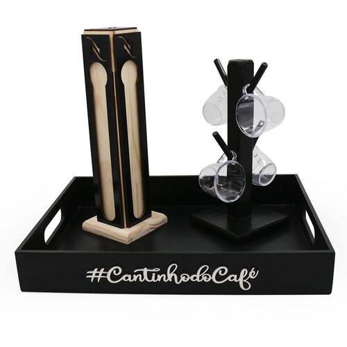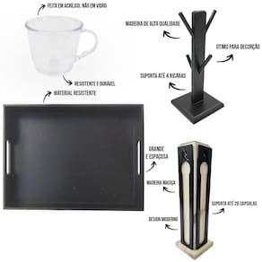 Kit 4 xicaras acrílico cristal porta capsulas para nespresso bandeja Composição do kit;4 xícaras1 bandeja1 suporte de xícaras1 porta capsulas para nespresso Xícara 85ml acrílica transparente As xícaras são muito bonitas e esse acrílico cristal traz um charme a mais ao produto, deixando-o mais decorativo para a hora do café. Você pode usar em casa ou no escritório, ter sempre à mão sua xícara para tomar aquele cafezinho, capuccino e até um chocolate quente se estiver com vontade. Capacidade 85mlMaterial - acrílicoAltura - 5,5 cmLargura - 8,5 cm Bandeja cantinho do café versátil e multiuso Feita em mdf de 6mm com pintura em tinta acrílica na cor preta ela é ideal para organizar o seu lar, servir um cafezinho para os amigos, organizar papeis de escritório entre diversas outras utilidades. Bandeja versátil de qualidade, combinando com todos os ambientes no qual estiver Suas medias são40x30x6 externa 38,5 x 28,5 x 5,5 na parte interna Possui as laterais vazadas como uma alça. Suporte porta xícara caneca 4 pinos xicaras Esse é o produto ideal para decorar o seu tão especial cantinho do café ou até mesmo presentear uma pessoa querida, além da beleza o porta xicaras é feito em mdf que é muito resistente, ideal para xicaras/canecas de até 240ml. Com esse porta xicaras você vai conseguir deixar seus armários muito mais organizados. Medidas suporte:Altura: 24 cmBase: 11x11Peso: 282gMaterial de composição: mdf Porta cápsula vazado a laser nespresso. O nosso porta cápsulas, guarda com segurança e deixa organizado prendendo bem a cápsula sem deixar cair produto bem desenvolvido com muito charme e tons modernos para deixar o ambiente mais bonito Esse porta cápsulas tem ar moderno que mescla os tons e veio da madeira de pinus com o local em preto aonde é encaixado as cápsulas sendo assim um da destaque ao outro organize seu canto do café com as cápsulas sempre a mão e ainda decore o seu ambiente com certeza vai ser uma peça que vai chamar a atenção e tirar elogios Feito em pinus de reflorestamento natural e de mdf com pintura em preto tinta acrílica Comporta 28 capsulas nespressoMedidas 32x10x10 O pinus é natural, não leva verniz e nem seladora. Por se tratar de madeira natural deve haver variações na tonalidade e apresentar veios da madeira em locais distintos. Perguntas frequentes: - entregam para todo país Quem somos Marca: Dupétriz