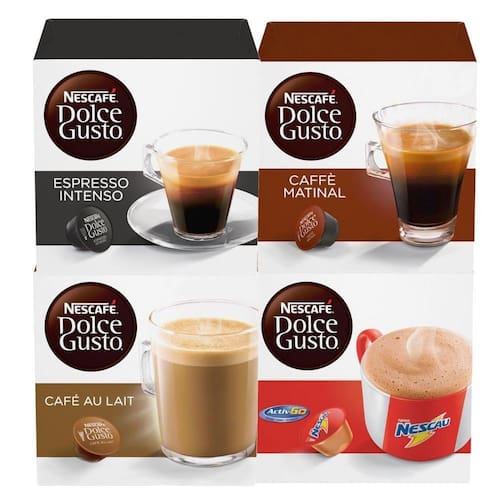 Kit 40 Cápsulas Café E Bebida Cremosa Dolce Gusto - CafezalePor que as Cápsulas da Dolce Gusto- Pressão perfeita para cada tipo de bebida.- Café, leite e cacau de alta qualidade.- Café sempre fresco. Cápsula inteligente, selada hermeticamente.- Sabores variados. Combinações criativas.Para Cafeteiras Dolce Gusto- Funcionam perfeitamente em todos os modelos de máquinas da Dolce Gusto. Sua cafeteira estará em perfeito estado sempre. - São compatíveis com os seguintes modelos da Dolce Gusto: Circcolo, Esperta, Drop, Fontana, Oblo, Stelia, Piccolo, Mini ME, Jovia. Lumio, Genio II e Movenza. Conteúdo do Kit- 4 caixa de 10 cápsulas Dolce Gusto. Totalizando 40 cápsulas.Sabores inclusos no Kit- 1x Espresso Intenso (Intensidade 7)Nosso café Espresso ainda mais aromático e intenso. Aroma floral, sabor levemente picante, amargo e forte. Não contém açúcar. Dose: 50 ml.- 1x Caff Matinal (Intensidade 9)O tradicional cafézinho brasileiro. Perfeito para o café da manhã. Não contém açúcar. Dose: 120 ml. - 1x NescauO sabor de Nescau, o achocolatado mais famoso do Brasil, em uma só cápsula. Contém Active-Go: um composto exclusivo com cálcio, ferro e vitaminas. Contém açúcar. Dose: 120 ml.- 1x Café Au LaitA combinação perfeita do café com leite. Em uma só cápsula, grãos selecionados do tipo Robusta e leite integral. Sem açúcar. Não contém açúcar. Dose: 180 ml.Detalhes do produto- Marca: Dolce Gusto- Fabricante: Nestlé- Validade: 6-9 meses- Condições de armazenamento: Conservar em local fresco e seco- Fabricado no Brasil- Ingrediente Espresso Intenso: café torrado moído. - Ingredientes Nescau: leite em pó integral, açúcar, soro de leite, cacau, sal, triglicerídeos de cadeia média (TCM), aromatizantes e emulsificante lecitina de soja. Alérgicos: contém derivados de leite e soja. Pode conter trigo, cevada e aveia.- Ingredientes Cappuccino. Cápsula café: café torrado moído. Cápsula à base de leite: leite em pó integral, açúcar e emulsificante lecitina de soja. Alérgicos: contém derivados de leite e soja. Pode conter trigo, cevada e aveia. - Ingrediente Caff Matinal: café torrado moído.