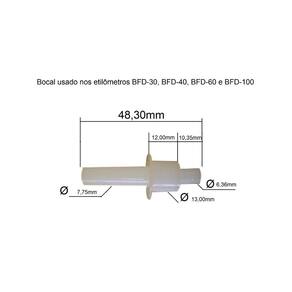 KIT 400 BOCAIS DESCARTÁVEIS PARA ETILÔMETROS DESCRIÇÂO: Bocais descartáveis para etilômetros / bafômetros proteção contra retorno de ar e proteção de barramento de líquidos Os bocais são compatíveis aos seguintes equipamentos: BFD-30 (INSTRUTHERM) BFD-40 (INSTRUTHERM) BFD-60 (INSTRUTHERM) BFD-100 (INSTRUTHERM) BAF-300 (ELEC) AT6000 ITBA-6000 ITENS FORNECIDOS: 400 - Bocais Etilômetro