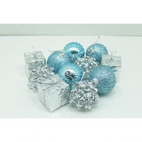 CORES: Azul e Prata; MATERIAL: Plástico, Isopor e Glitter; MEDIDAS: Diâmetros 5cm 50mm; CONTEÚDO DA EMBALAGEM: 4 Kit Com 11 Pingentes Azul E Prata De 5cm Para Árvore De Natal;