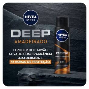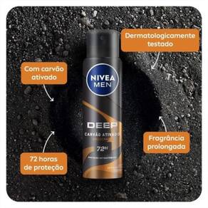Nivea men deep anti-transpirante com proteção de 48hrs, proporcionando uma sensação duradoura de pele limpa e seca, exatamente como após o banho - sua fórmula eficaz com carvão ativado atua poderosamente contra bactérias e proporciona uma fragrância amadeirada com notas de chocolate e lavanda. Benefícios - o poder do carvão ativado em uma fragrância masculina de longa duração. - sensação de frescor e limpeza. - proteção antitranspirante eficaz por até 48h. - dermatologicamente testado.
