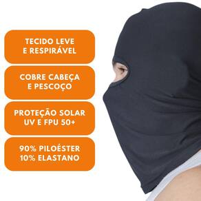 Capuz ajustável que cobre a cabeça e o pescoço, proporcionando proteção adicional contra os raios solares. Fácil de lavar e secagem rápida, dispensando o uso de amaciante e ferro de passar.