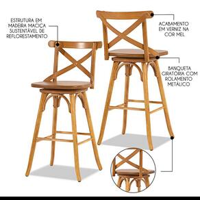 Se você está procurando uma banqueta que se destaque em todos os ambientes, precisa conhecer a Banqueta Espanha. Com um design moderno, ela possui base giratória para se adequar perfeitamente à sua necessidade. A Banqueta Espanha é perfeita para ser utilizada em diversos espaços, como a bancada da cozinha americana, balcões altos em espaços gourmet, mesas bistrô no cantinho do churrasco e muito mais. Ela traz estilo e funcionalidade para qualquer ambiente em que for colocada. Produzida com materiais de excelente qualidade, a Banqueta Espanha garante maior durabilidade e resistência. Não perca mais tempo procurando a banqueta perfeita. Então não perca mais tempo e venha conhecer nosso catálogo e deixar sua casa mais completa e cheia de estilo com todos os produtos da Rio Madeira Interiores. CARACTERÍSTICAS TÉCNICAS: - Produzido em Madeira Maciça Sustentável - Acabamento em Verniz na cor Mel - Sistema Giratório 360° com Rolamento Metálico - Banqueta Entregue Montada *Kit Composto por CINCO Banquetas INFORMAÇÕES TÉCNICAS: Altura Total: 108 cm Altura Chão até Assento: 75 cm Altura Encosto: 34 cm Largura Total: 47 cm Largura do Assento: 47 cm Profundidade Total: 50 cm Profundidade Assento: 44 cm Peso: 9 kg INFORMAÇÕES ADICIONAIS: Garantia para defeitos de fabricação conforme Código de Defesa do Consumidor. - Produto em madeira maciça natural, podendo ocorrer variação no tom ou cor da madeira. - As imagens ambientadas são meramente ilustrativas e podem apresentar itens que não compõe o produto, as cores do produto podem variar de acordo com o monitor, a iluminação do ambiente ou sua percepção visual. - Limpeza: Deve ser feita com pano macio e seco ou levemente umedecido com água e sabão neutro. Não devem ser utilizados abrasivos.