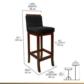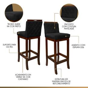 Apresentamos a banqueta Nice, feita com madeira maciça de reflorestamento e acabamento em verniz. Seu assento preenchido com espuma D26 e encosto com espuma D23 garantem conforto duradouro. O encanto adicional vem da costura matelassê no encosto, enquanto o revestimento em suede adiciona uma sensação de luxo. Adapta-se perfeitamente a qualquer espaço, adicionando elegância e conforto instantaneamente. CARACTERÍTICAS TÉCNICAS: - Produzido em Madeira Maciça de Reflorestamento; - Acabamento em Verniz na cor Castanho; - Assento Preenchido com Espuma D26; - Encosto Preenchido com Espuma D23; - Encosto com Costura Matelassê; - Revestimento em Suede na cor Preto. *Indicada para Bancadas/Mesas com Alt. 100/105 cm. *PRODUTO ENVIADO MONTADO. INFORMAÇÕES TÉCNICAS: Altura Total: 102 cm Altura até Assento: 75 cm Altura até Travessa: 23 cm Altura Encosto: 35 cm Largura Assento: 38 cm Largura Estrutura: 36 cm Profundidade Total: 42 cm Profundidade Assento: 41 cm Peso: 7 kg *Kit Composto por 5 Banquetas Nice. INFORMAÇÕES ADICIONAIS:ATENÇÃO: Móvel produzido em madeira maciça natural podendo ocorrer mudança no tom da madeira conforme o produto;*Conferir se o produto está de acordo com o que comprou, produto danificado não será aceito troca;**As imagens ambientadas são meramente ilustrativas e podem apresentar itens que não compõe o produto. As cores do produto podem variar de acordo com o monitor, a iluminação do ambiente ou sua percepção visual;***Limpeza deve ser feita com pano macio e seco ou levemente umedecido com água e sabão neutro. Não devem ser utilizados abrasivos como palha de aço e objetos cortantes;Garantia para defeitos de fabricação conforme Código de Defesa do Consumidor. Marca: CCS Interiores