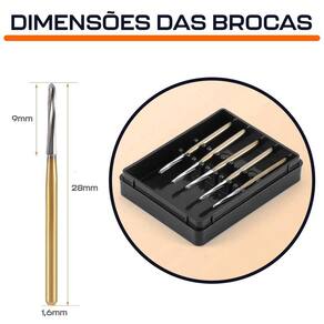 Kit 5 Brocas 1.6mm Alta Velocidade para Dentistas e Trabalhos de Precisão - Marca: AZDENT - Referência: BD-K5 - Material: Carbureto de Tungstênio - Jogo com 5 brocas e estojo - Hastes em aço inox - Haste das brocas: 1.6mm - Comprimento das brocas: 28mm - Garantia: 90 dias contra defeitos de fabricação Marca: Azdent