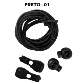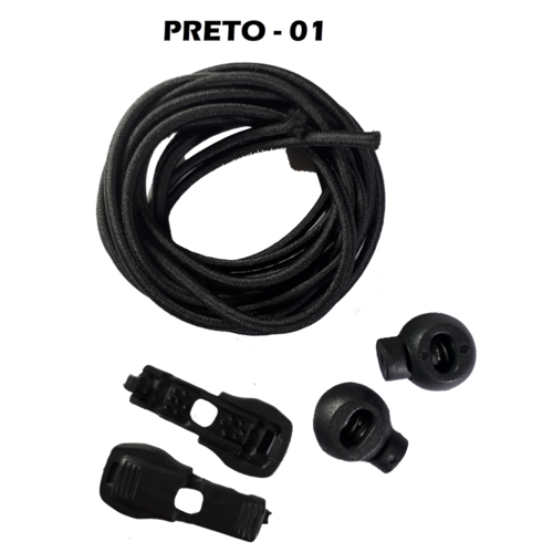 Cada embalagem contém : 1 par de cadarços elásticos de 3mm de diâmetro com 110 cm de comprimento, 2 Reguladores, 2 ponteiras.