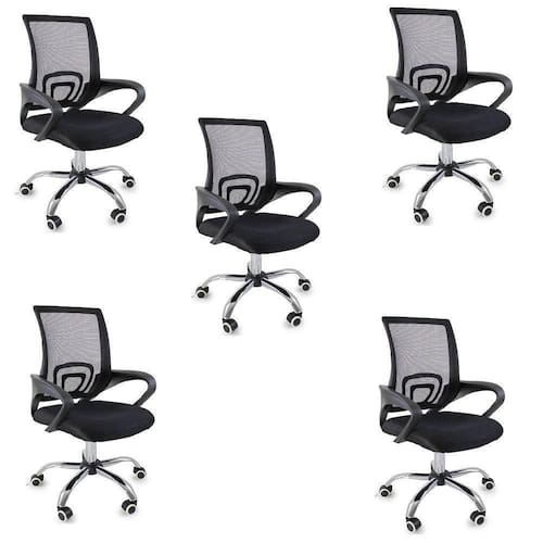 Kit 5 Cadeiras De Escritorio Begonia Tela Mesh Ergonomica - Preto A escolha de uma cadeira adequada é muito importante para evitar futuras lesões. Com esta cadeira da Begônia você terá o conforto é o bem-estar que precisa ao longo do seu dia. Além disso, você pode colocá-la em qualquer lugar da sua casa ou oficina, pois o seu design se adapta a vários ambientes. Dê um toque mais moderno aos seus espaços! Ajuste-a a sua medida Com seu ajuste de altura, você poderá fixar a posição de seu torso em relação à mesa de trabalho e assim obterá uma cadeira mais confortável ao nível de suas necessidades. Cuide do seu corpo Os apoios de braços vão favorecer a sua postura ao escrever e o ajudarão a se incorporar com mais facilidade quando quiser. Mantenha-se em movimento As rodas permitirão a você mover e limpar facilmente o seu espaço. Você será capaz de movê-la sem dificuldade quando precisar.Além disso, sendo giratória, permitirá que você gire o assento 360 sem a necessidade de mudar de posição ou se mover de onde você está. Altura Total: 100-90 cm Braço até o chão: 75-63 cm Assento até o chão: 58-46 cm Encosto: 48 cm Braço: 28 cm Largura 1 Perna: 25 cm 2 Pernas: 50 cm Assento: 45 cm Encosto: 40,5 cm Braço: 4,5 cm De um braço ao outro: 54 cm Comnto Encosto: 2 cm Assento: 47,5 cm Braço: 30 cm Peso: 5,5 kg Estrutura: Nylon e aço cromado Revestimento: Nylon, Tela Mesh Braço: Polipropileno Assento: Madeira multi laminada Peso máximo recomendado: 110 Kg Marca: Oficial Webshop